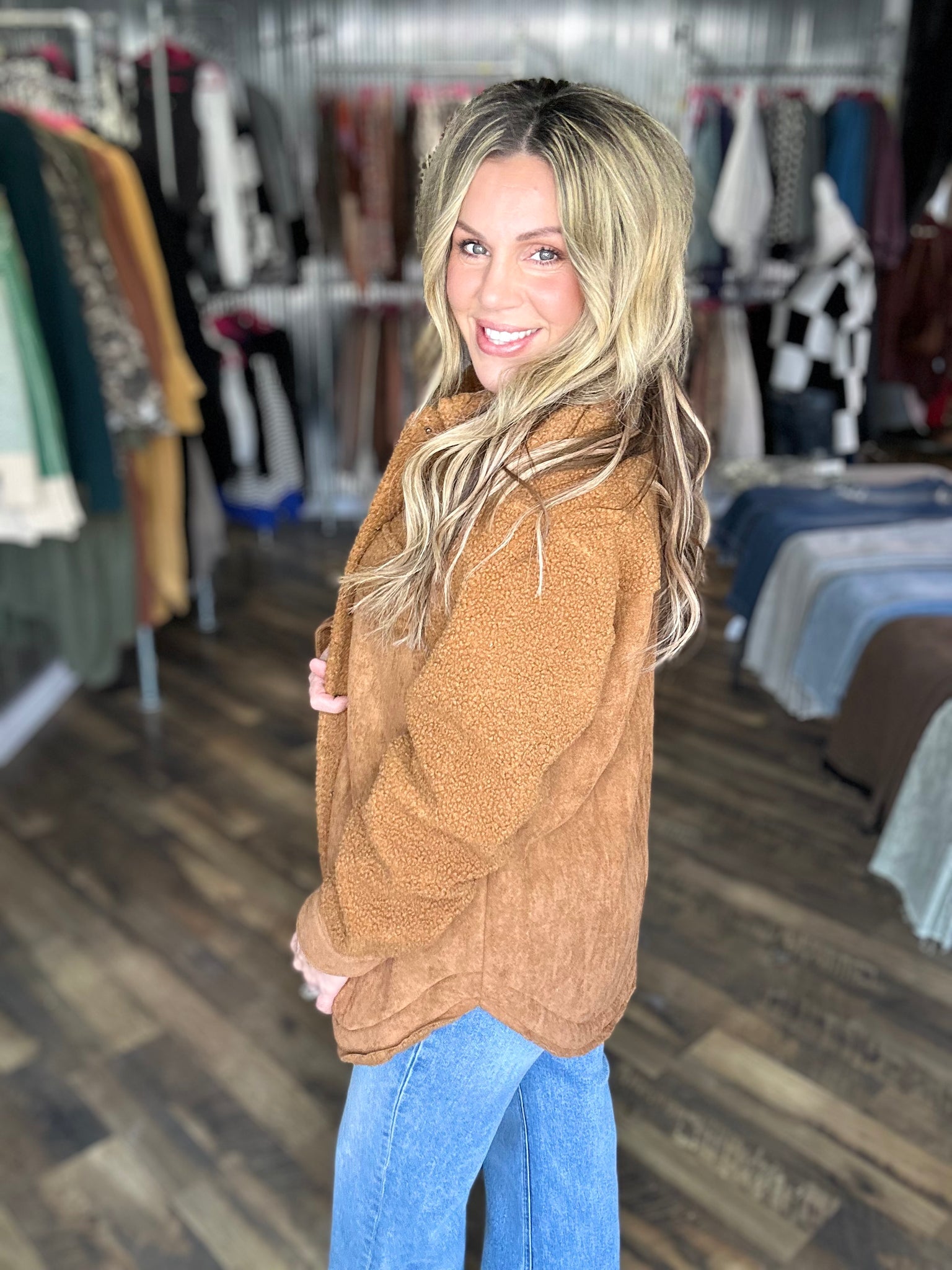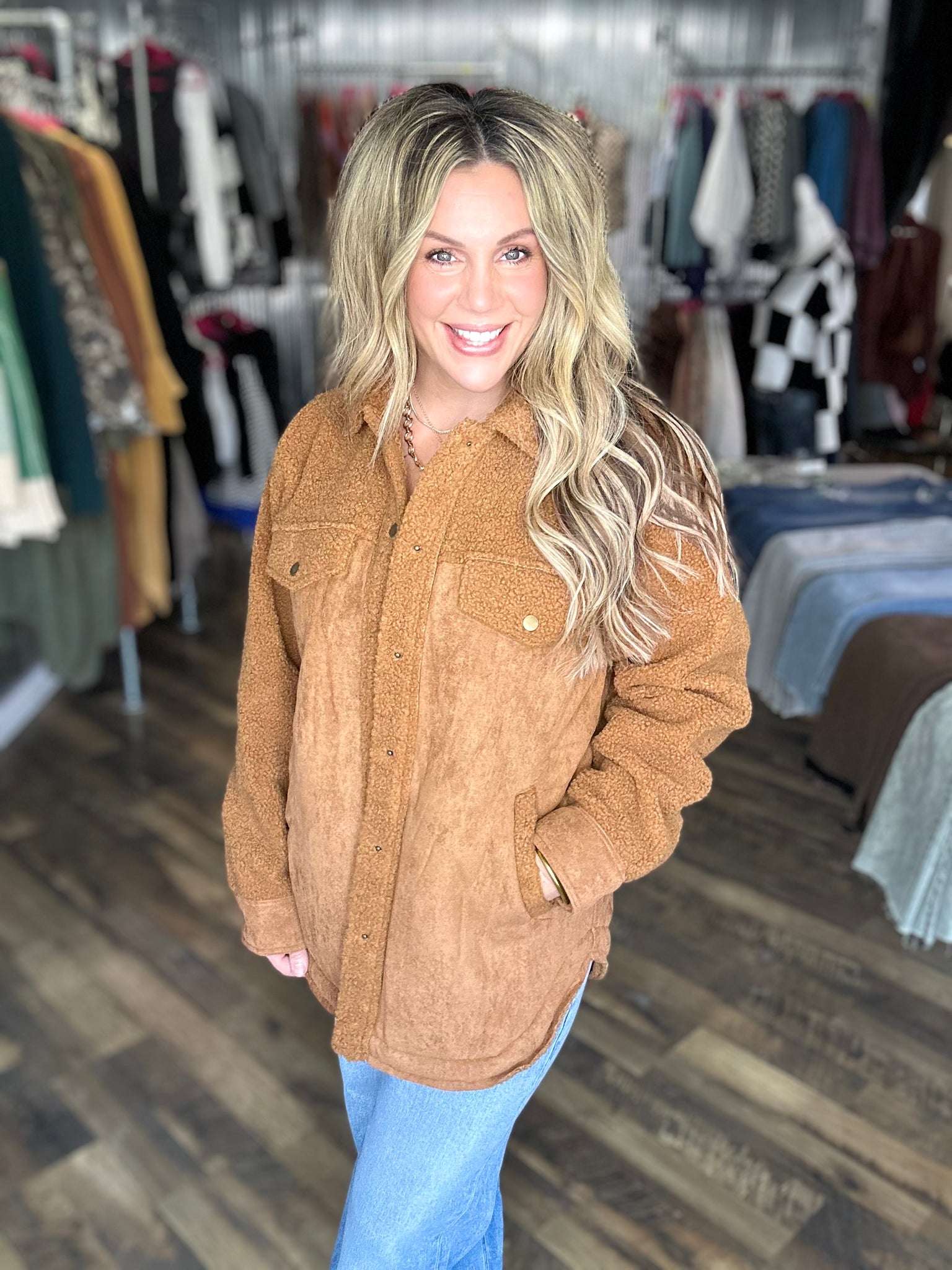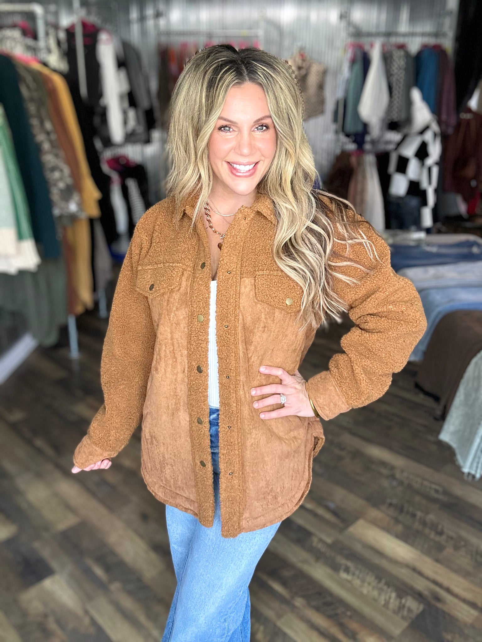 Congac Faux Suede Oversized Button Down Jacket with Pockets