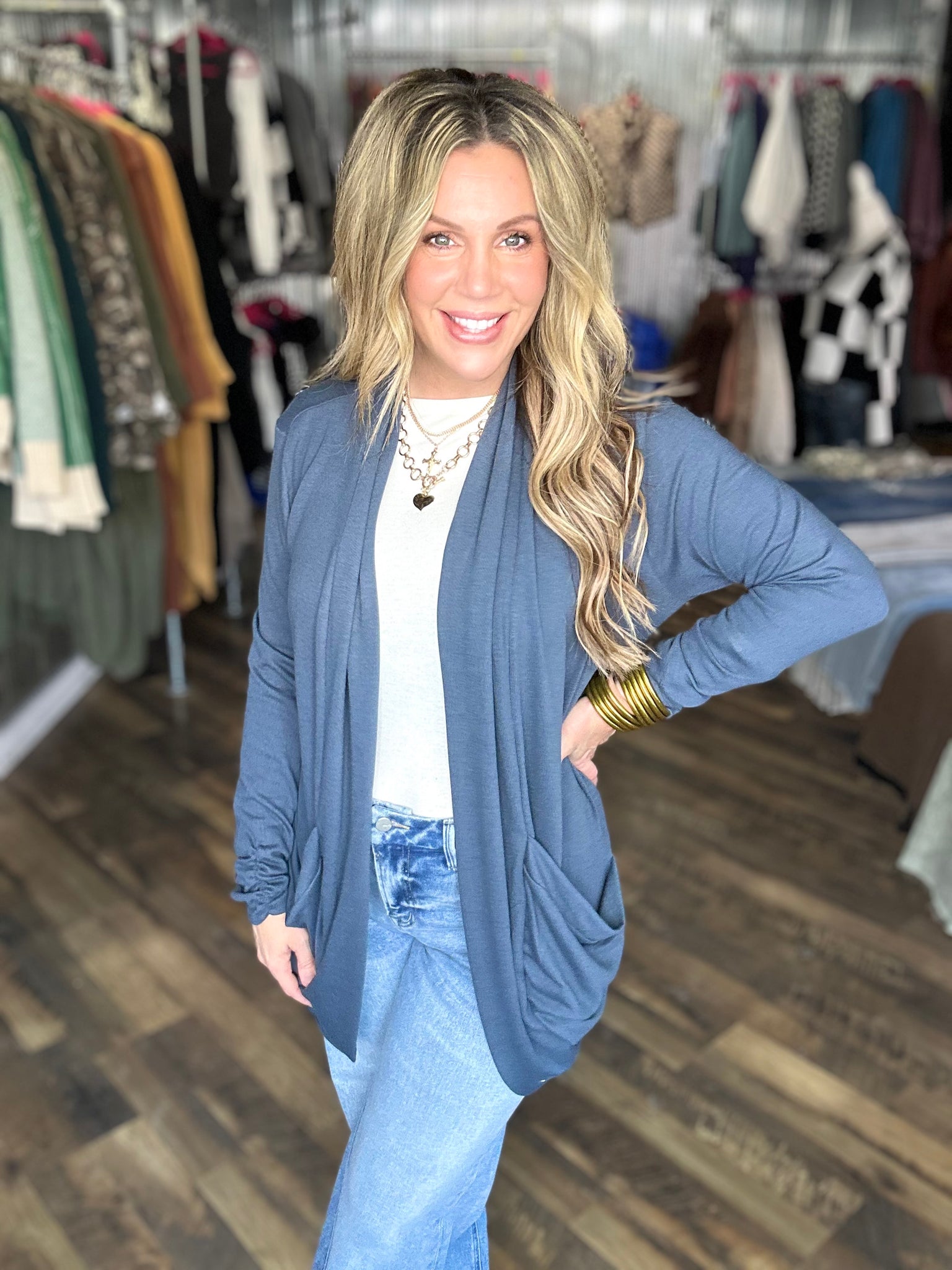 Blue Grey Soft Wrap Shirred Side Open Cardigan
