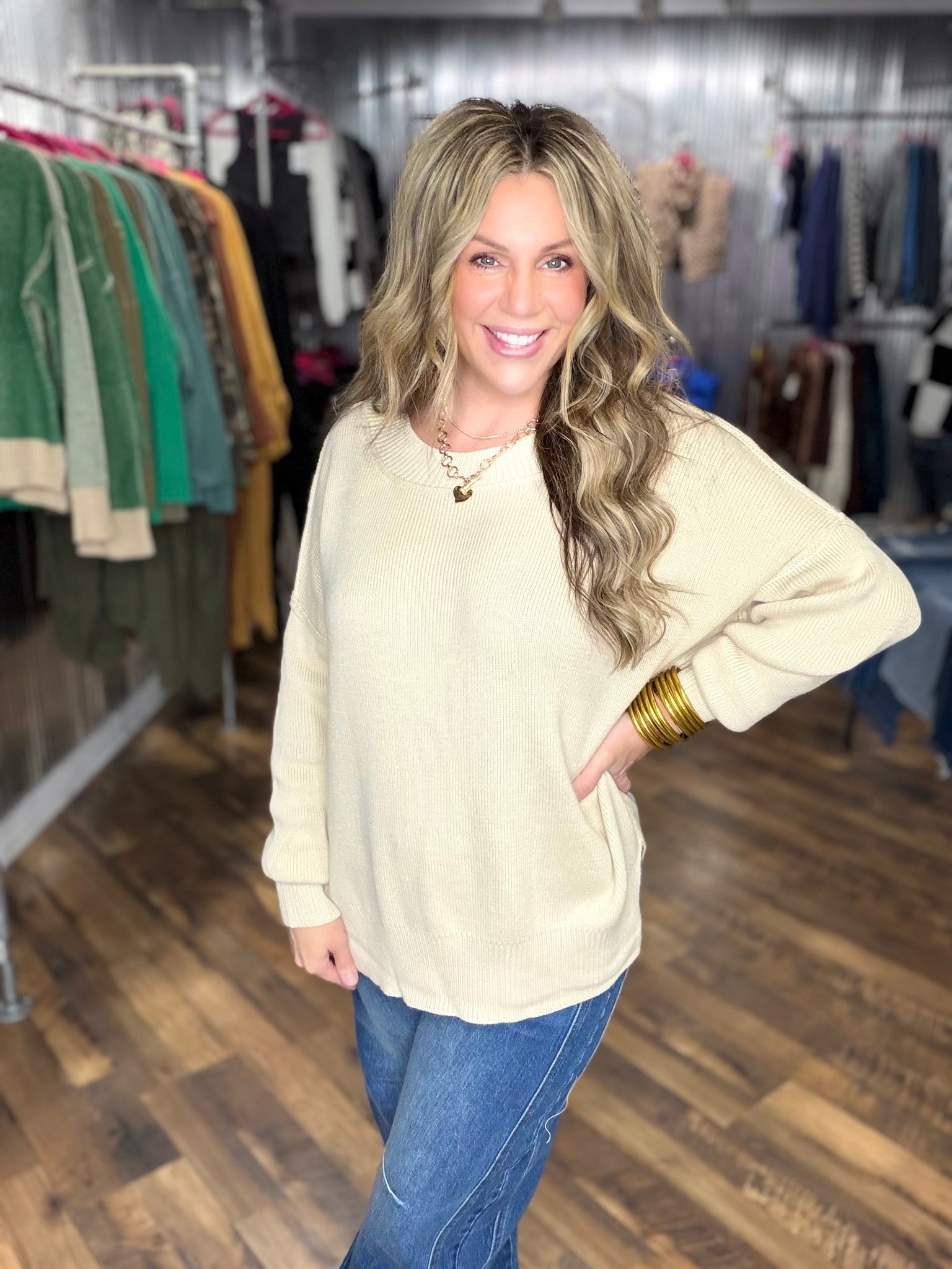 Solid sweater top featuring boat neck, dropped shoulder, long sleeves and slit hem