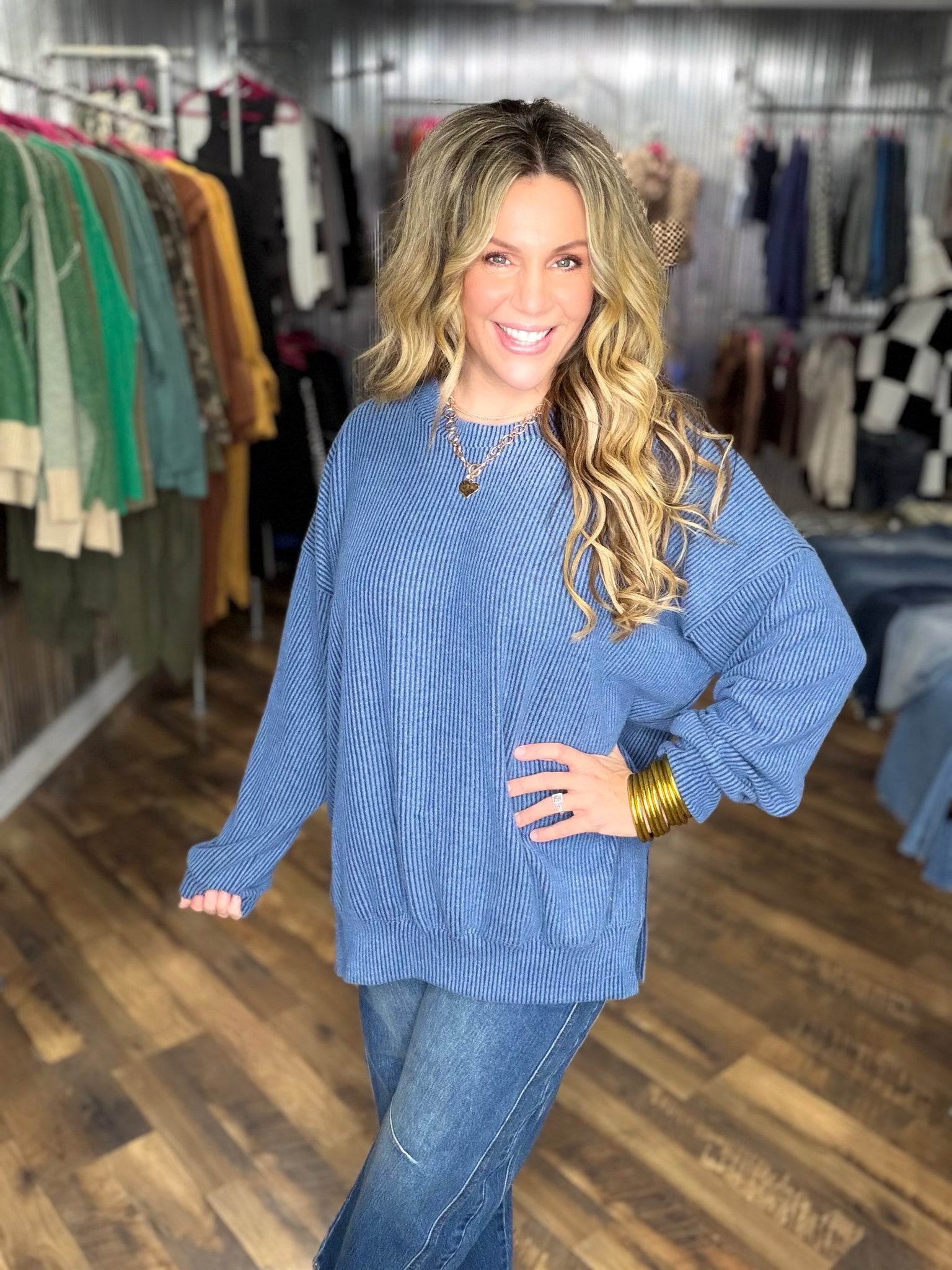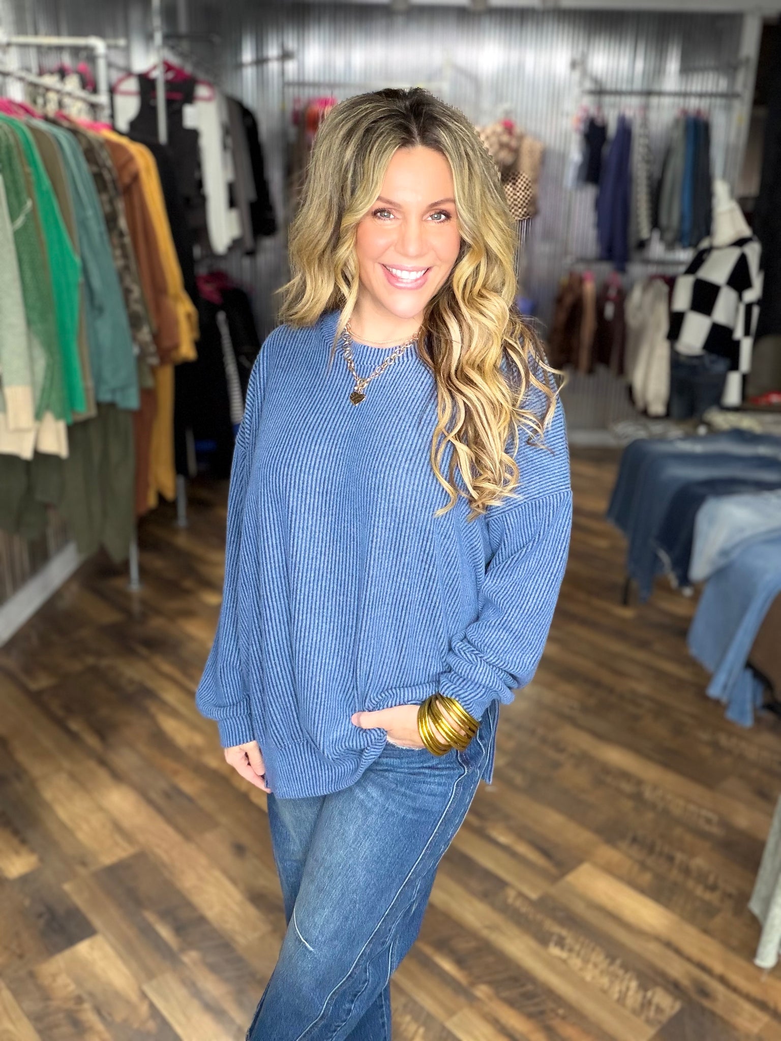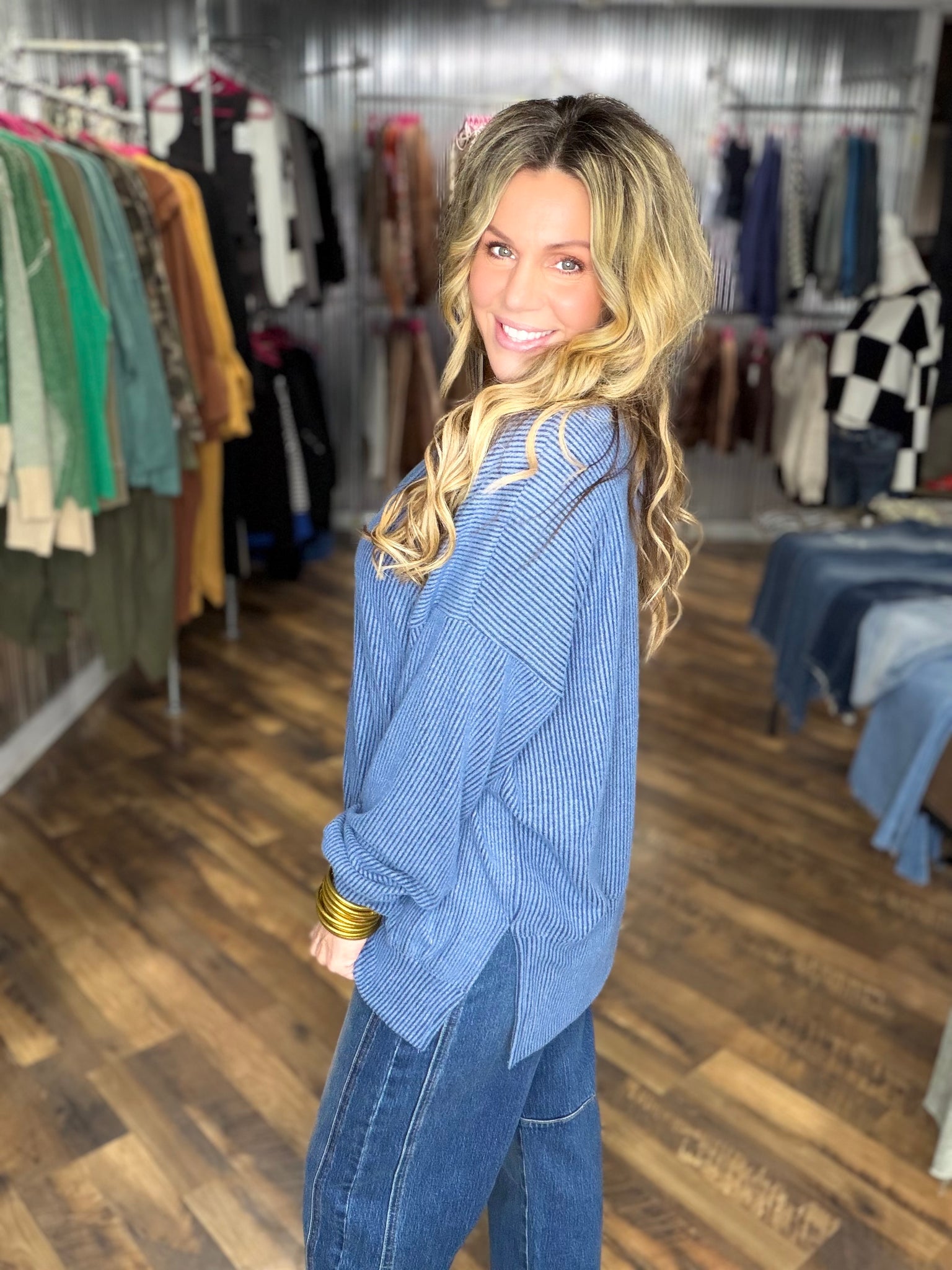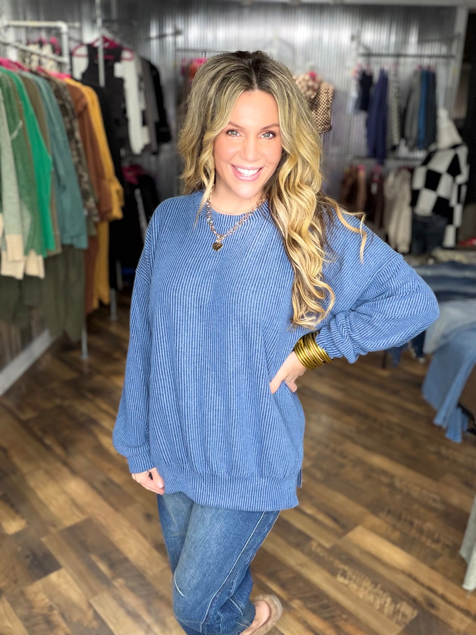 Denim Blue Brushed Ribbed Textured Oversized Top with Side Slit