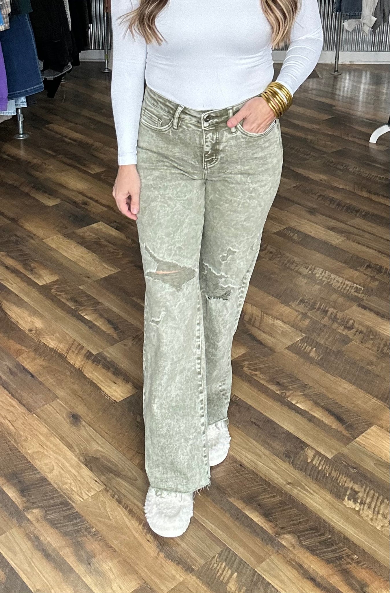 Mica Acid Olive High Rise Tummy Tuck Wide Leg Denim Jeans