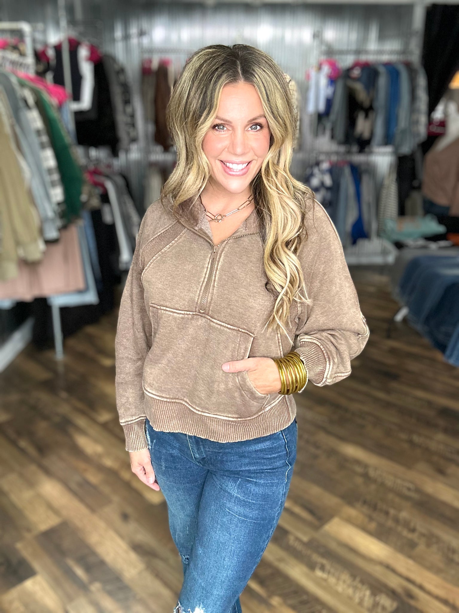 Mocha Acid Washed Half Zip Fleece Hoodie Kangaroo Pocket