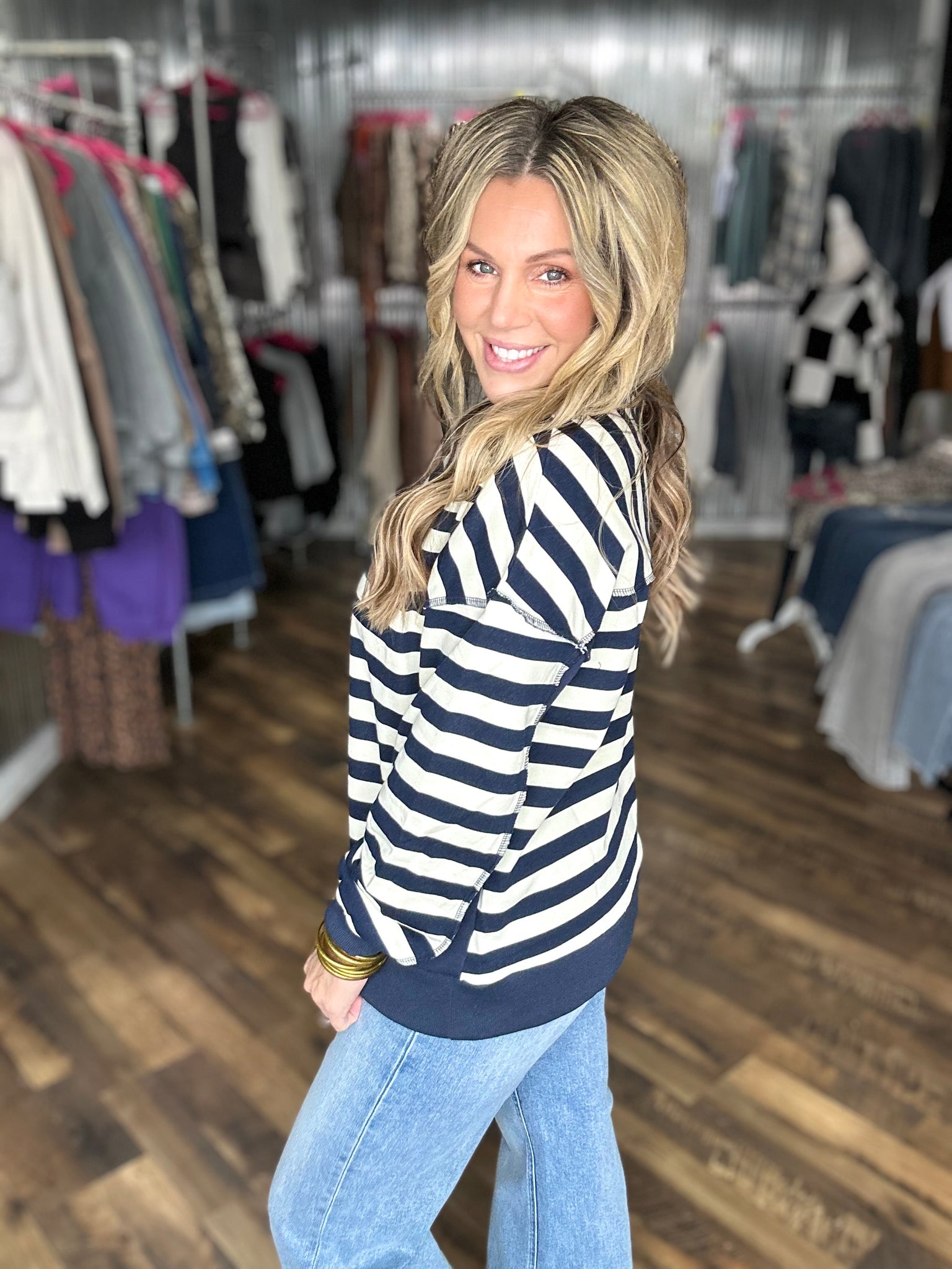 Navy Oversized Striped Half Button Down Casual Knit Top