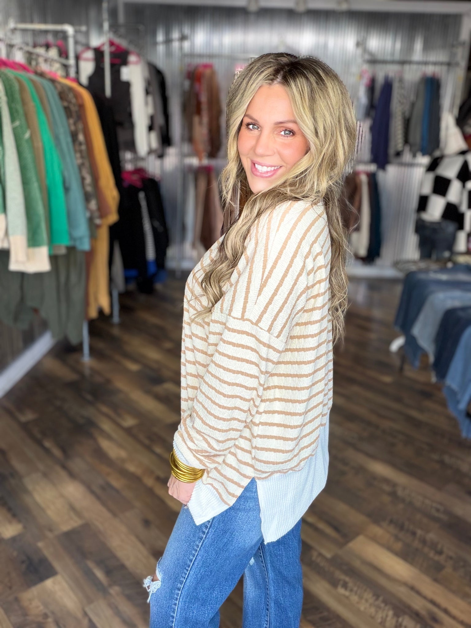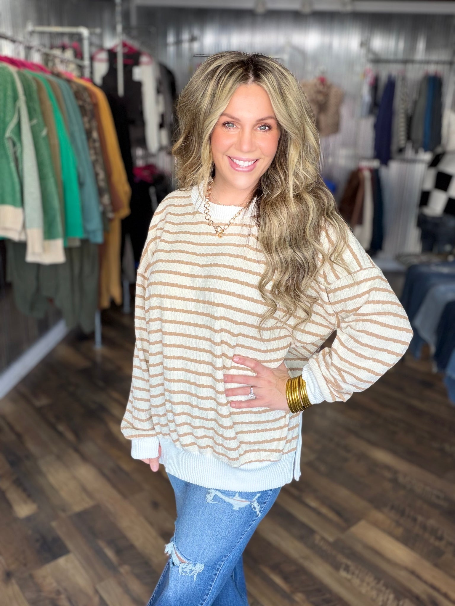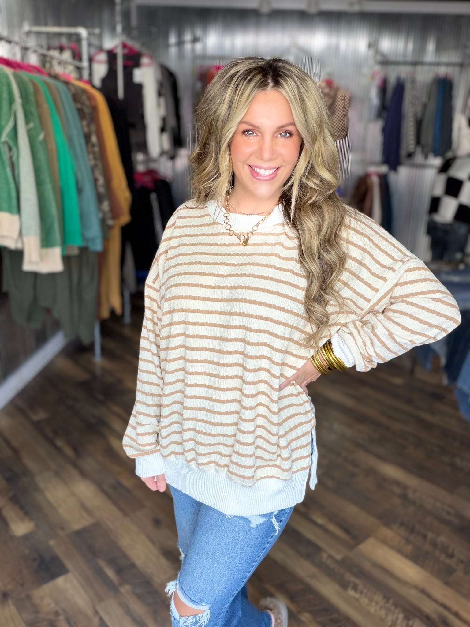 Taupe Bubble Stripe Tunic With Side Slit